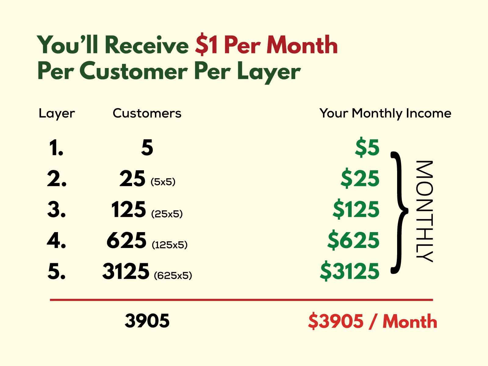 You will receive $1 each on your personal sponsored Affiliate’s sales or auto fill (Level 1), $1 each on the sales of the people they personally sponsor or auto fill (Level 2), $1 each on Level 3,4 and 5.